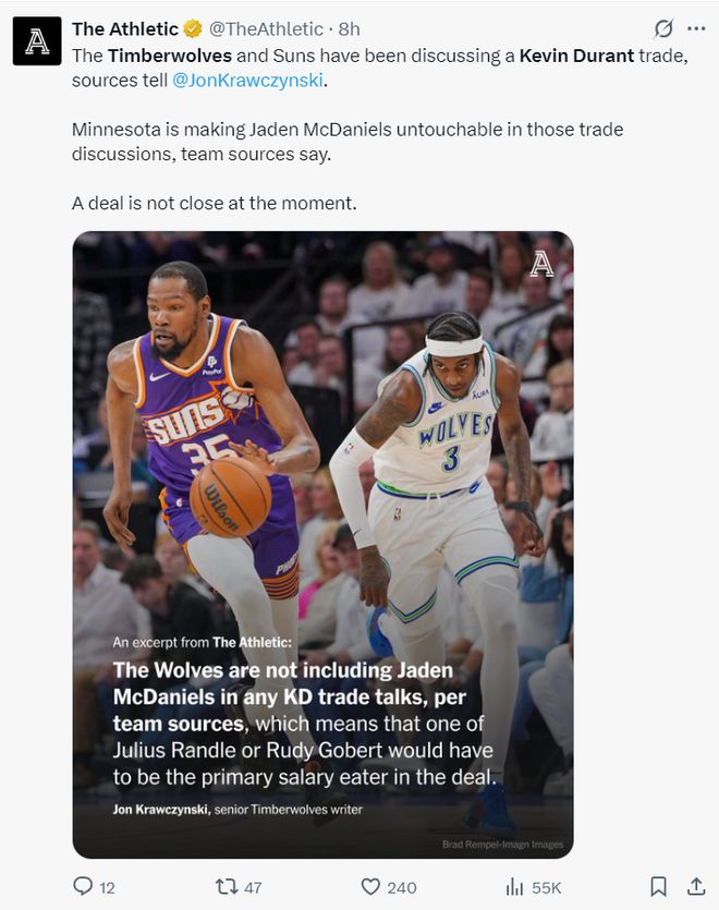 根据TA的报道,森林狼在杜兰特的交易中拒绝送出麦克丹尼尔斯,火箭队想要加盟火箭或者马刺,但交易都不太好达成,太阳对马刺的报价不满意,火箭对引进杜兰特存疑。